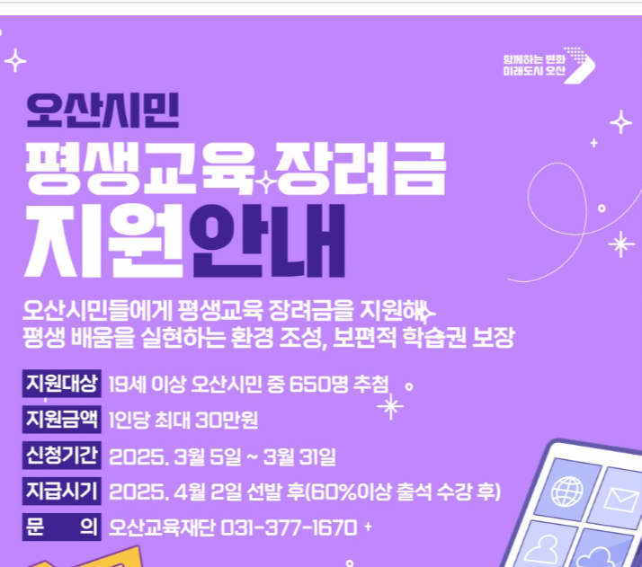오산시 평생교육장려금 지원 총정리 안녕하세요. 오늘은 경기 오산시에서 시행하는 '평생교육장려금' 지원 사업에 대해 소개해드리려고 해요. 이 사업은 오산시민들이 다양한 학습 기회를 누릴 수 있도록 돕기 위해 마련된 제도인데요. 만 19세 이상 시민 650명을 선발해 연간 최대 30만 원의 교육장려금을 지원한다고 하니, 관심 있는 분들은 꼭 주목해 주세요. 그럼, 이 사업의 세부 내용과 신청 방법 등을 하나씩 살펴보겠습니다.평생교육장려금이란?오산시의 평생교육장려금은 시민들이 다양한 교육 프로그램에 참여할 수 있도록 지원하는 제도입니다. 이 사업은 오산시가 지역 주민들의 배움의 기회를 넓히고 평생학습을 활성화하기 위해 도입한 것입니다.선정된 시민은 연간 최대 30만 원의 장려금을 지원받아 다양한 교육 콘텐츠를..