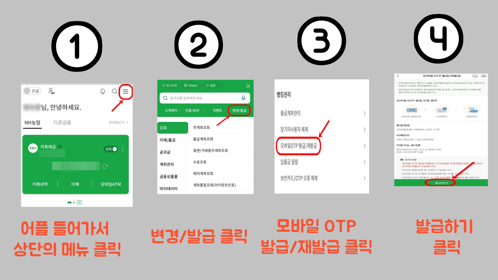 농협은행 모바일 OTP 발급 및 이체한도 늘리기모바일 OTP 발급 방법농협은행의 모바일 OTP를 발급받는 과정은 간단합니다. NH스마트뱅킹 앱을 통해 쉽게 발급받을 수 있습니다. NH스마트뱅킹 앱 NH스마트뱅킹 앱 실행 후 우측 상단의 메뉴 버튼 클릭검색창에 'OTP' 입력'모바일OTP 발급/재발급' 선택'발급하기' 버튼 클릭비대면 발급 선택USIM 본인인증 또는 공동인증서 본인인증 진행비대면 실명인증 (신분증 준비 필요)본인 계좌 확인 (계좌번호 및 비밀번호 입력)모바일 OTP 비밀번호 설정이체한도 설정발급 완료모바일 OTP로 이체한도 늘리기모바일 OTP를 발급받으면 이체한도를 크게 늘릴 수 있습니다.기존 보안카드 사용 시:모바일 OTP를 발급받으면 이체한도를 크게 늘릴 수 있습니다.기존 보안카드 사용..